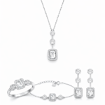 Un ensemble raffiné et harmonieux fabriqué en argent sterling 925, conçu pour sublimer l’élégance féminine avec une touche de luxe intemporel. Son design se distingue par une pierre centrale carrée entourée de détails scintillants qui captent magnifiquement la lumière.